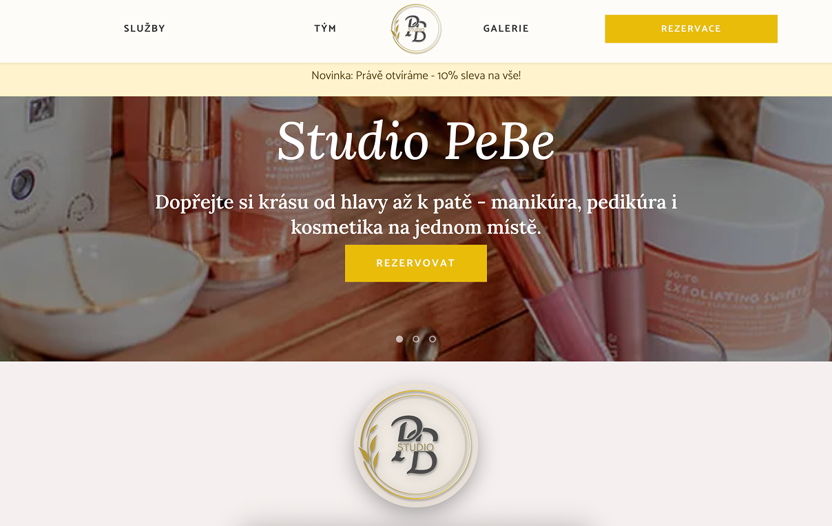 Web beauty studia s nabídkou manikúry, pedikúry a kosmetických služeb. Elegantní prezentace profesionální péče na jednom místě.